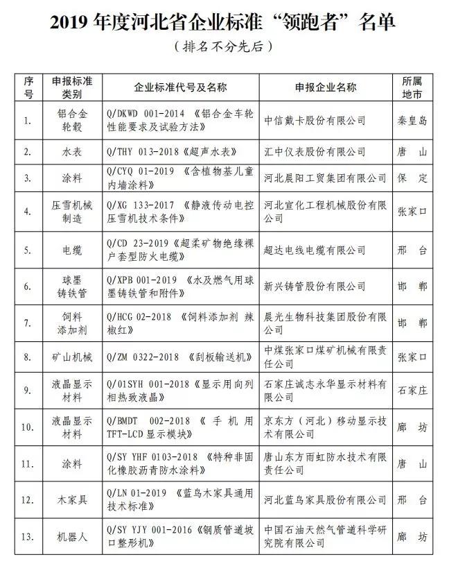 此次評選,圍繞企業標準先進性水平、標準編制水平、標準實施情況、企業服務能力、企業管理水平等五個方面進行了綜合評審,共138家企業參評。評選中,根據河北省市場監督管理局等八部門《關于實施企業標準 “領跑者”制度的落實意見》(冀市監發〔2018〕37 號)、《河北 省市場監督管理局關于 2019 年省級企業標準“領跑者”工作的 實施意見》的要求,按照“科學、 公開、公正”的原則,經企業申報,各地市推薦,省標準化研究院審查和比對分析,并征求有關部門的意見。在此基礎上,最終確定了《2019年度河北省企業標準“領跑者”名單》。