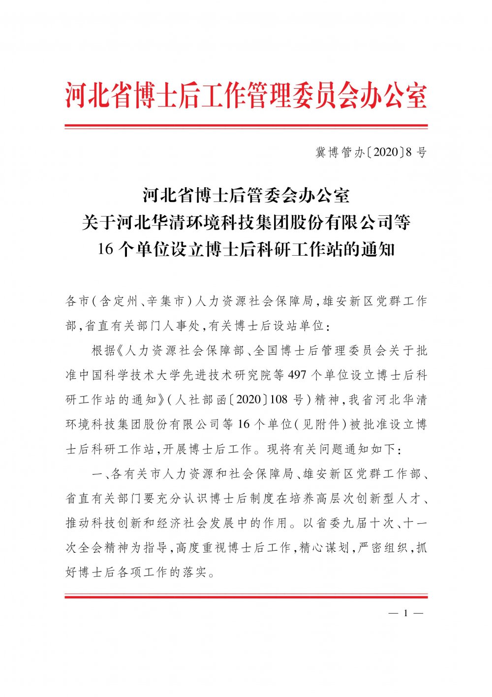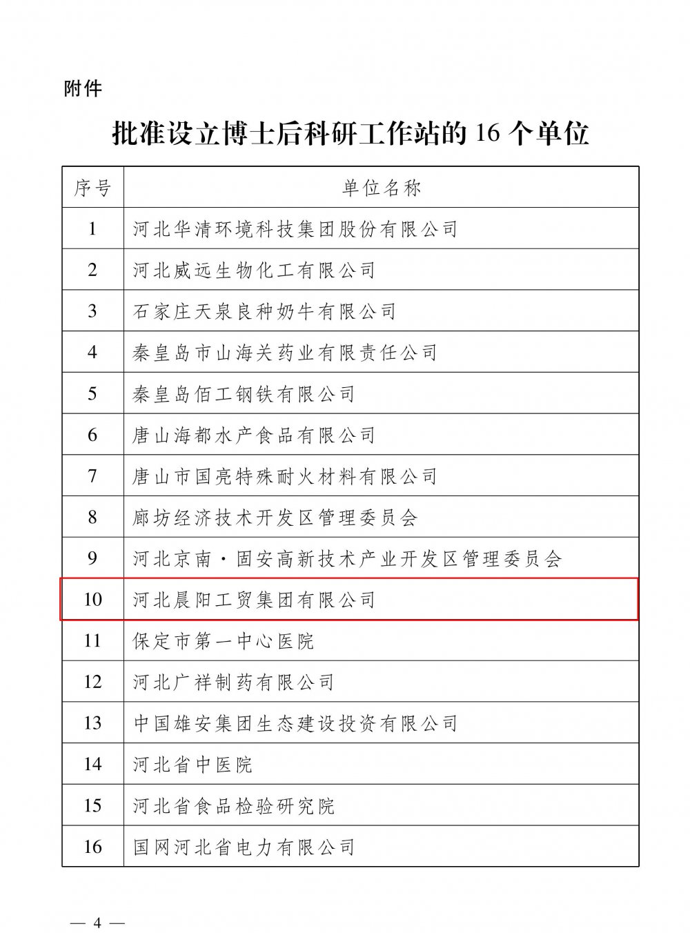 此次河北省被批準設立博士后科研工作站的16個單位分別為河北華清環境科技集團股份有限公司、河北威遠生物化工有限公司、石家莊天泉良種奶牛有限公司、秦皇島市山海關藥業有限責任公司、秦皇島佰工鋼鐵有限公司、唐山海都水產食品有限公司、唐山市國亮特殊耐火材料有限公司、廊坊經濟技術開發區管理委員會、河北京南·固安高新技術產業開發區管理委員會、河北晨陽工貿集團有限公司、保定市第一中心醫院、河北廣祥制藥有限公司、中國雄安集團生態建設投資有限公司、河北省中醫院、河北省食品檢驗研究院、國網河北省電力有限公司。